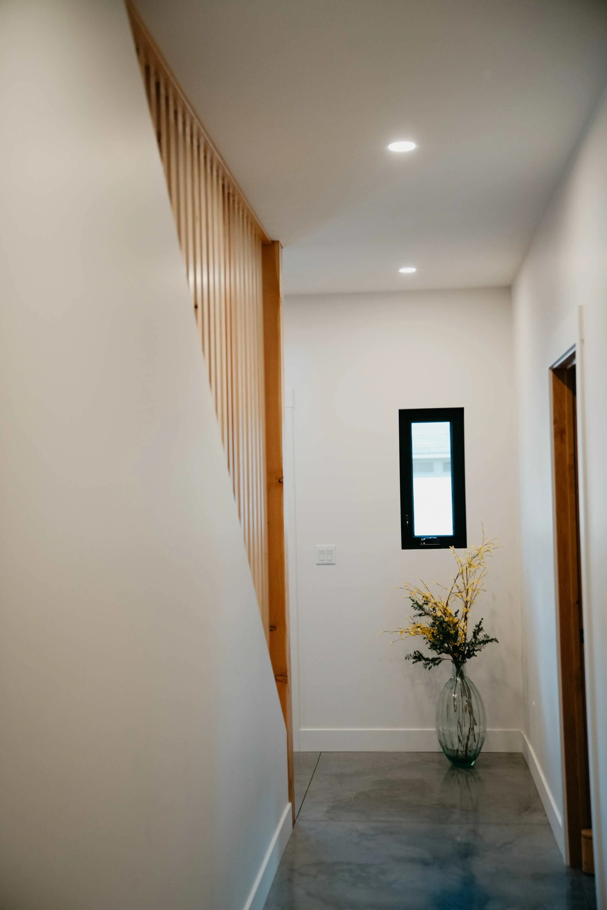 The main staircase linking the entrance and upper bedrooms to the heart of the home is anything but ordinary. Subtle wooden bowties in each step, paired with a sleek metal railing and elegant beams, make it a standout feature.