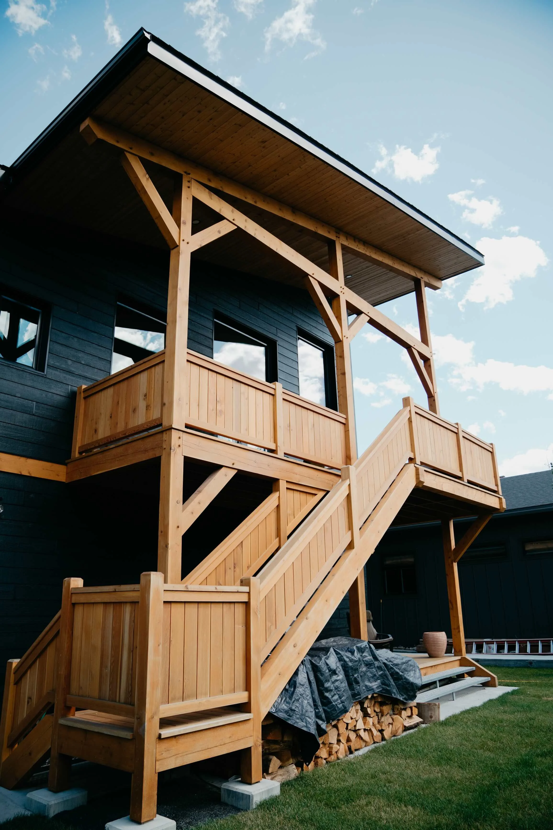 A timber frame covered balcony extends from the kitchen, overlooking the backyard and embracing mountain views, offering protection from the summer sun and winter snow. The staircase leads directly to the yard, adding convenience to everyday living.