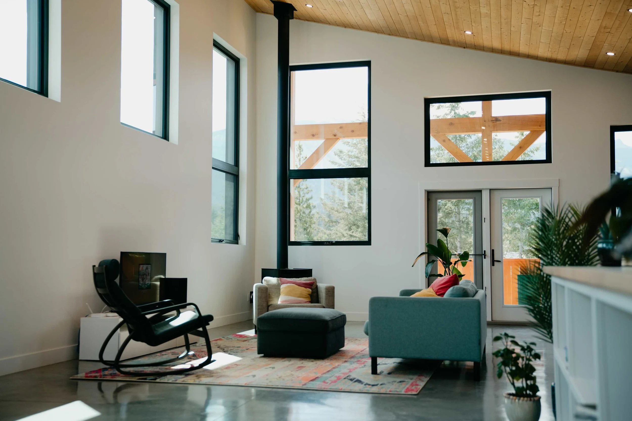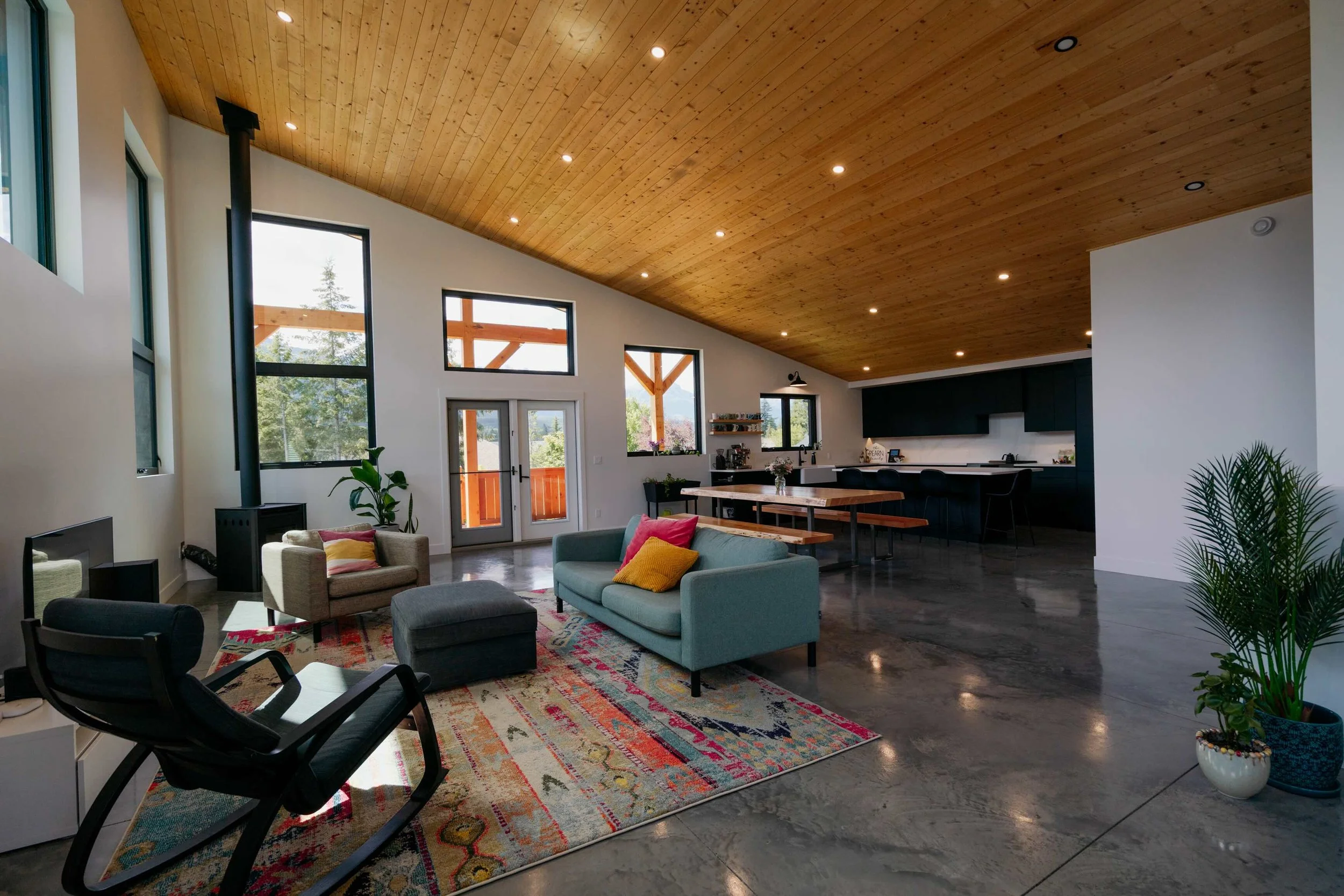 This three-bedroom, two-bathroom home features an open-concept main floor with polished concrete floors for durability and contrast against the wood ceilings. A spacious garage provides storage for seasonal gear, while the basement offers the ultimate play zone - every kid’s dream space.